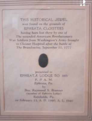 At the time of the constitution, during the early days of the Lodge’s labors and throughout the history of the lodge, numerous gifts of furnishings, tools, etc., were presented to the Lodge. The first recorded was a unique and treasured gavel presented by Brother Elmer L. Billingfelt, a resident of Adamstown and a member of Isaac Hiester Lodge No. 660. Reading. It remains on display among the Lodge’s memorabilia. The head of the gavel was made of stone taken from the quarries of King Solomon under the city of Jerusalem- the same site from which the stone was taken for the Temple constructed by King Solomon. The handle was made of olive wood taken from the Mount of Olives.